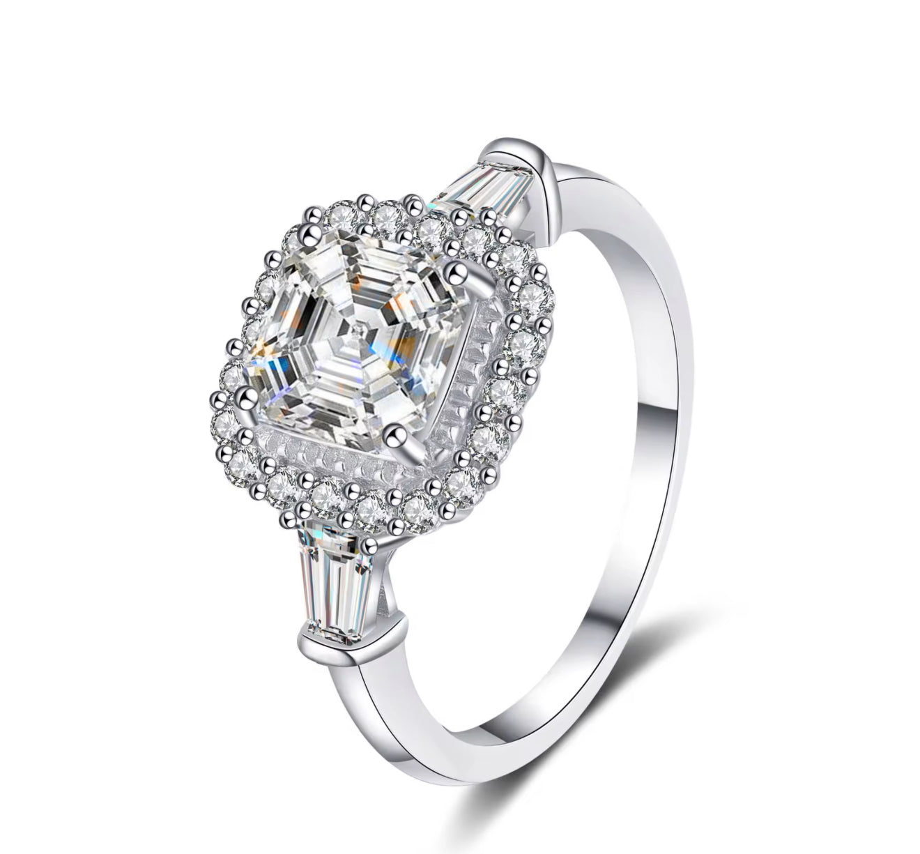 This Moissanite Ring showcases a 2-carat moissanite gemstone set in S925 sterling silver, composed of 92.5% pure silver. The moissanite offers exceptional brilliance and durability, closely resembling a diamond’s sparkle while providing an affordable alternative. Crafted for lasting wear, this ring combines elegance and strength, making it an ideal choice for special occasions and meaningful moments.